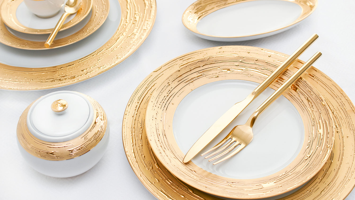 Our most decadent collection. 24k gold rim, hand-painted with matte and shiny gold, this collection is a statement.