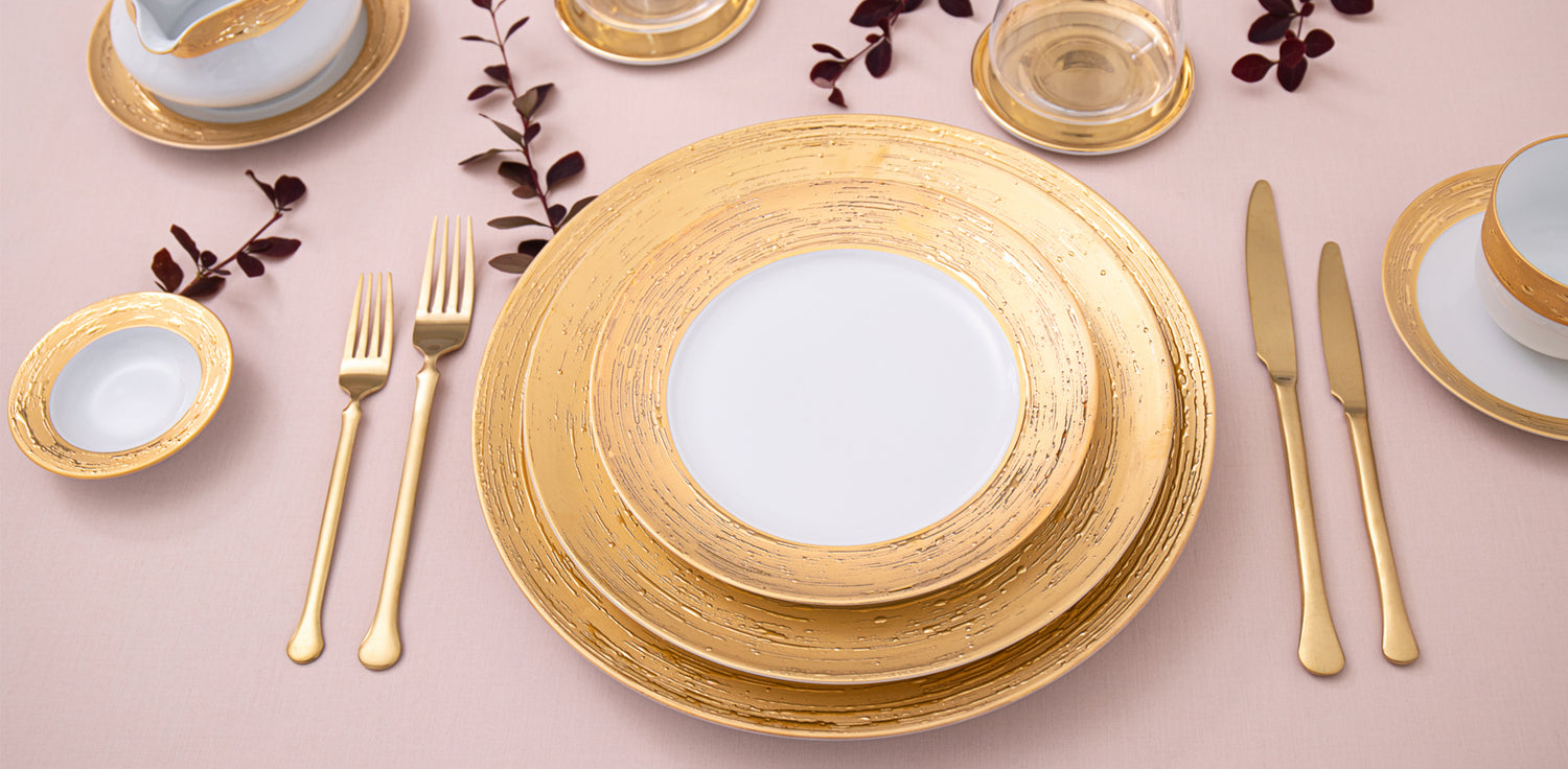 Our most decadent collection. 24k gold rim, hand-painted with matte and shiny gold, this collection is a statement.
