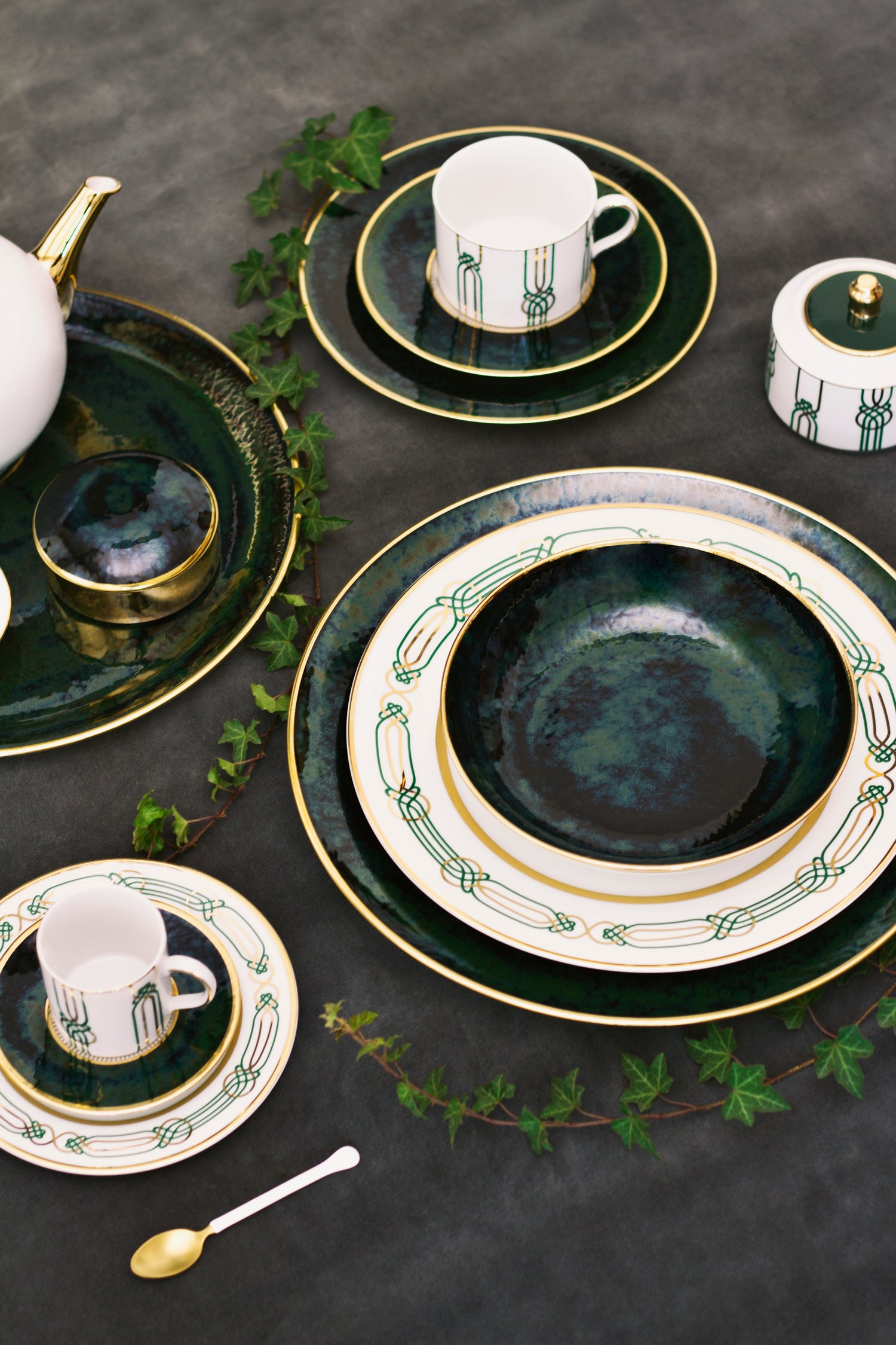 Capturing the rich green tones of the Amazon Rainforest, our Lush Forest collection uses a green malachite glaze to achieve a truly stunning effect. Each piece is then hand-brushed with 24k gold to create an opulent setting.