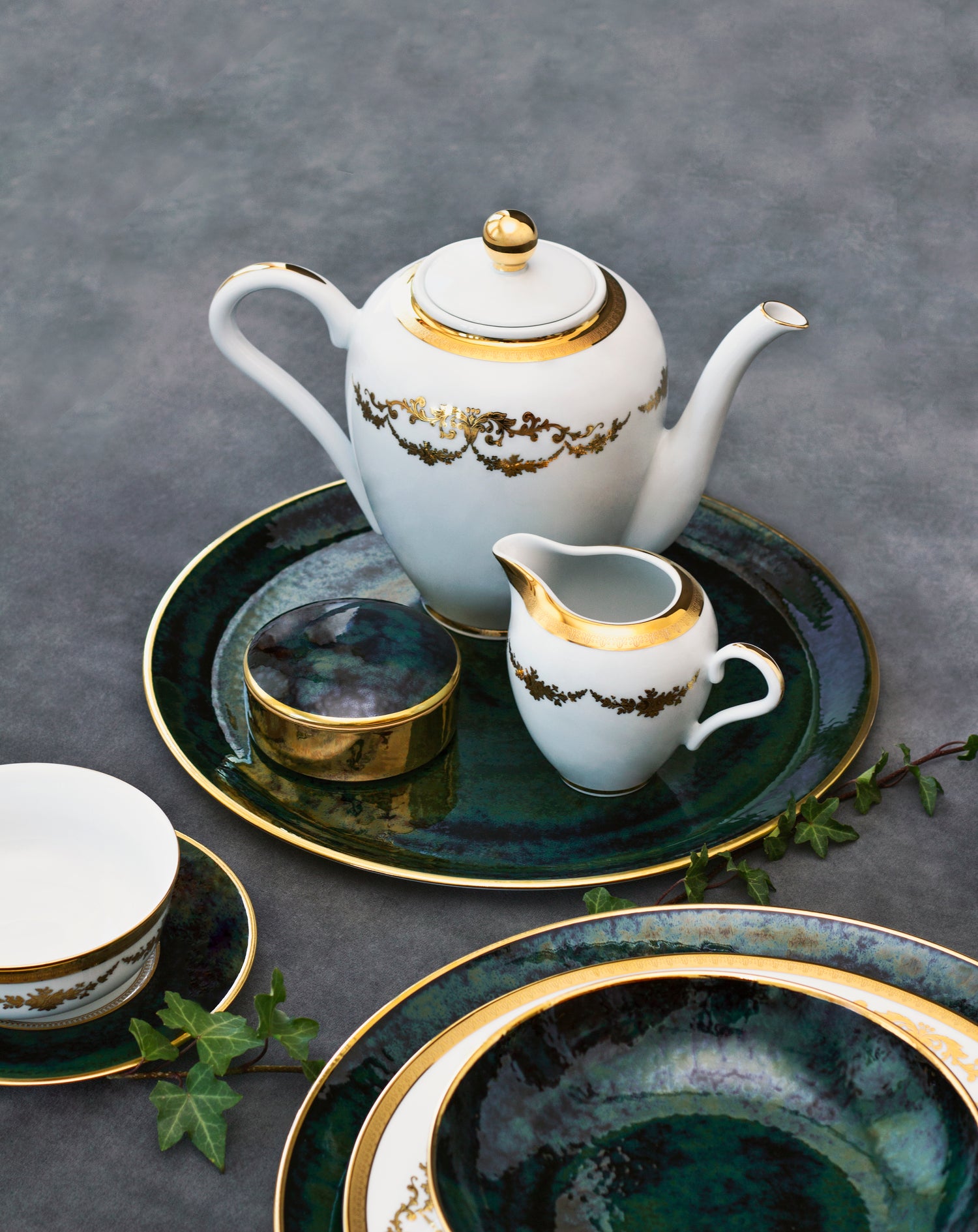 - French porcelain; reactive green malachite glaze; gold-rimmed